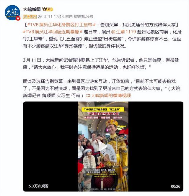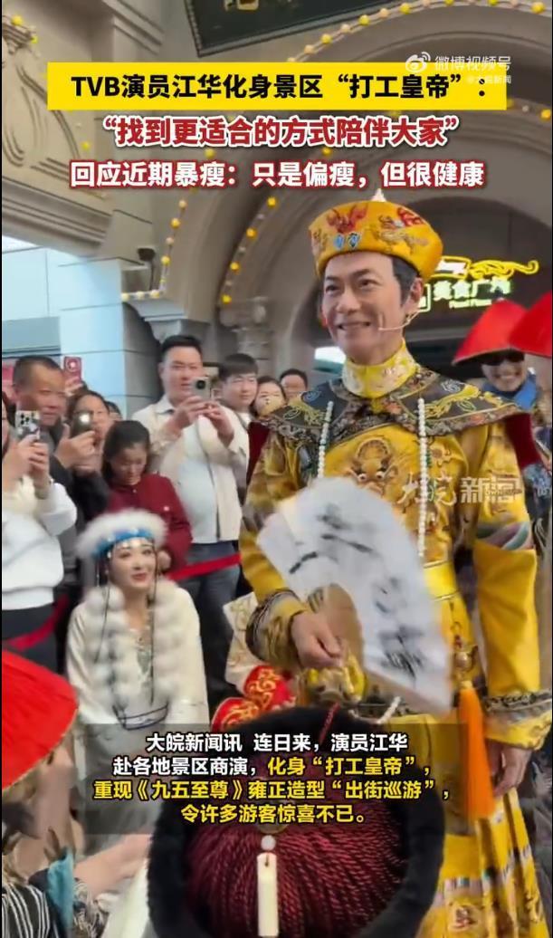 从TVB的荧屏皇帝,到穿梭于各大景区的“巡游皇帝”,江华的职业转型不可谓不大。在外界看来,这或许有些“掉价”,但对他本人而言,这或许是一种放下身段、直接拥抱观众的自在与坦然。不用在剧组连轴转,却能以最经典的形象,在最放松的环境里,接受观众最直接的喜爱与欢呼,这种“陪伴”确实别有一番滋味。