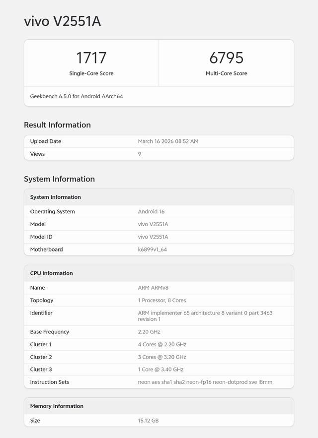 iQOO Z11搭载联发科天玑8500处理器,该机的GeekBench6跑分成绩出炉,其中单核成绩为1717分,多核成绩为6795元。让人意外的是,参与跑分的机型拥有16GB超大运存,看来iQOO Z11的顶配版至少为16GB+512GB,这才是中端性能旗舰应该有的样子。至于该机的峰值性能和游戏表现,可以参考此前发布的红米Turbo5,该机的顶配版也是16GB+512GB。